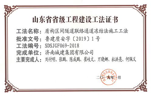 集团“盾构区间隧道联络通道冻结法施工工法”被评为山东省省级工程建设工法