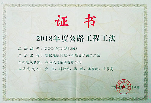 集团“暗挖隧道薄壁钢管砼支护施工工法”被评为2018年度公路工程工法