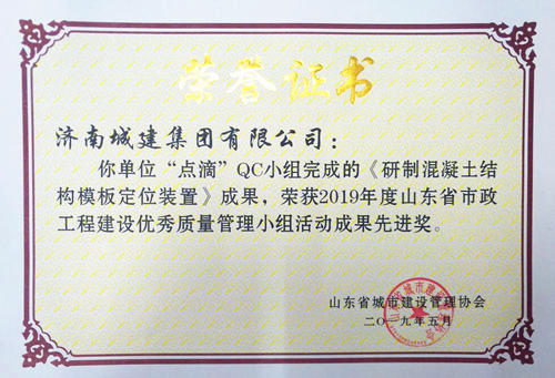 集团“点滴”QC小组完成的《研制混凝土结构模板定位装置》成果荣获“2019年度山东省市政工程建设优秀质量管理小组活动成果先进奖