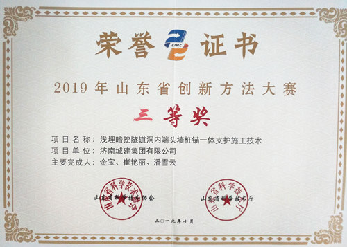 集团《浅埋暗挖道洞内端头墙桩锚一体支护施工技术》荣获“2019年度山东省创新方法大赛三等奖”