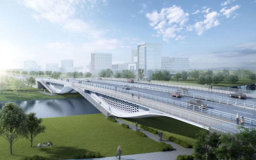 济南新旧动能起步区横二路大寺河桥梁项目由法国MARC MIMRAM INGENIERIE S.A.公司与东南大学建筑设计研究院联合设计,马克·米姆拉姆先生担任主设计师,设计以灵动、通透的外形,打造“善感知、会呼吸、有温度”的桥梁。项目建成后对打通交通节点,实现桥梁与周边环境和谐统一,统筹市政桥梁与慢行交通系统,打造先行区地标性景观桥梁等方面具有重要意义。