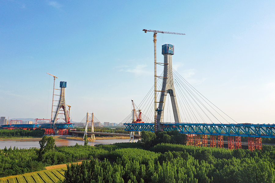 集团承建的G104京岚线济南黄河公路大桥扩建工程主桥为双塔双索面公轨两用钢析梁斜拉桥,主跨488米,是黄河上在建最大跨径公轨两用斜拉桥。主桥索塔高168.6米,宝瓶形构造,造型新颖、施工难度大、技术要求高。项目部严格按照住建部、省、市危险性较大的分部分项工程安全管理规定、危险性较大的分部分项工程专项施工方案编制指南及相关要求,成立技术创新小组、施工部署方案策划评审领导小组等组织机构,充分调动技术人员积极性、创造性,编制了《索塔专项施工方案》,并成功应用于本工程索塔施工中,达到安全生产、降本增效的目的,为推动集团高质量发展蓄势赋能。