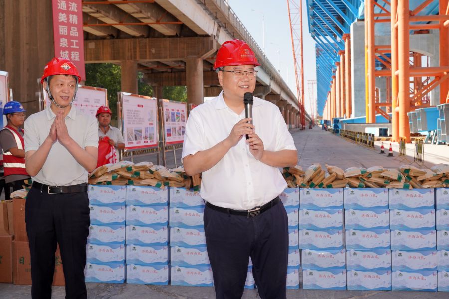 史海成董事长将防暑降温物品送到施工一线建设者手上,感谢工程建设者们为城市建设所付出的辛勤努力,叮嘱大家注意身体,合理安排作息时间,切实做好个人防护,保证安全作业。他强调,项目部要严格落实安全生产主体责任,确保各项防暑降温措施落实到位,切实保障施工人员的身体健康和生命安全,筑牢施工安全生产底线,不断提高工程质量、安全文明施工和整体服务水平,确保施工安全与项目进度两不误,为黄河流域生态保护和高质量发展作出贡献。