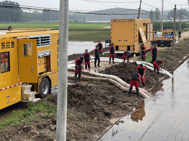 8日至9日,集团应急救援队抵达临沂费县,通过对临沂市受灾情况的勘查和摸排,随后赶往莒南县板泉镇、筵宾镇开展应急抢险工作。经过对当地农田、周边环境积水情况的实地勘查,救援队制定了排水工作方案和安全防范措施,力争在最短时间排出积水。目前,2辆5000m³和4000m³大型排水车、3台大型排水泵站全速运转,对1000余亩农田积水进行强排作业,为有序恢复人民群众正常生产生活开足马力。