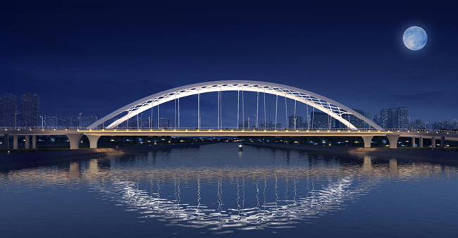 集团承建的二里桥路跨京杭运河节点工程(曲江大桥)项目连续上跨滨河西路、京杭运河、东外滩路(规划),主桥采用“钢箱提篮拱”结构,由拱肋和交织的横撑组成,相依相靠,形成稳定结构。设计灵感源自扬州“月亮城”的文化意象。侧观桥体,两向内收拢的拱肋形如弯月,网状横撑交织成轻盈的弧线;夜间灯光亮起时,桥影与水中明月相映成趣,恰似“二分明月落长河”的诗意画卷。桥型勾勒出了古朴静谧的扬州,穿越千年,风姿如故,它宜清风、宜月色,人与自然相互包容,与扬州打造“文化旅游名城、生态宜居名城” 的规划相得益彰。