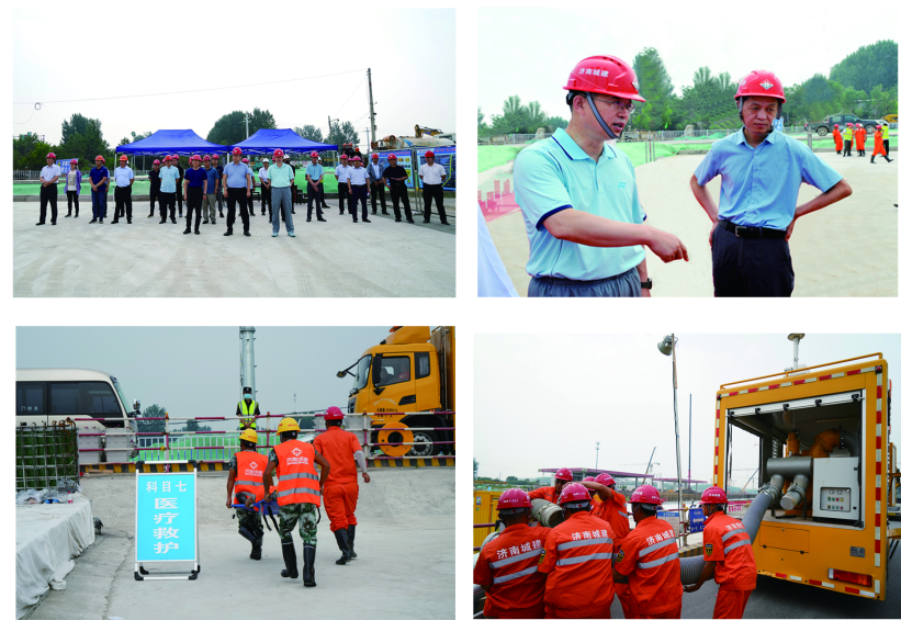此次演练模拟济南市起步区黄河大道连日来普降大到暴雨,黄河大道一期工程三标段周边水位迅速上涨,已基本与基坑围堰持平,严重危及作业人员和设备安全的场景。防汛演练共进行了疏通两侧排水沟、沙袋围堰、临时用电、水泵排水、人员疏散、交通封闭、医疗救护、汛中上报、汛后回复、调拨新型排水车排水等10个科目的内容,演练参与人员100余人。