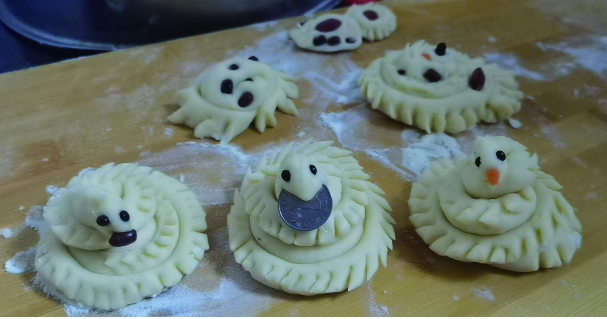 说做就做!和面、准备大枣、花生、花椒种子,清洗硬币,揉面、捏造型、摆上装饰,一家老小忙碌得不亦乐乎,年幼的孩子坐在姥姥身边,像模像样地学着,姥姥手把手教给她,还惟妙惟肖地让圣虫盘在莲花底座上,母亲一边做一边给孩子讲“圣虫”的故事,“这个动物叫做圣虫,是一种祝福,代表年年有余,嘴里含着钱,早早发财,圣虫做好可以放在米缸里、衣柜里、钱橱里,寓意明年财物越来越多”“这个是葫芦,代表福禄的意思,就是希望家里人都有福气”,五岁的女儿一切都是好奇,甚是开心,听得津津有味。看着一老一小,想起我的奶奶,小时候我奶奶也曾这样手把手地教给我,这就是传承,年俗的传承,文化的传承。