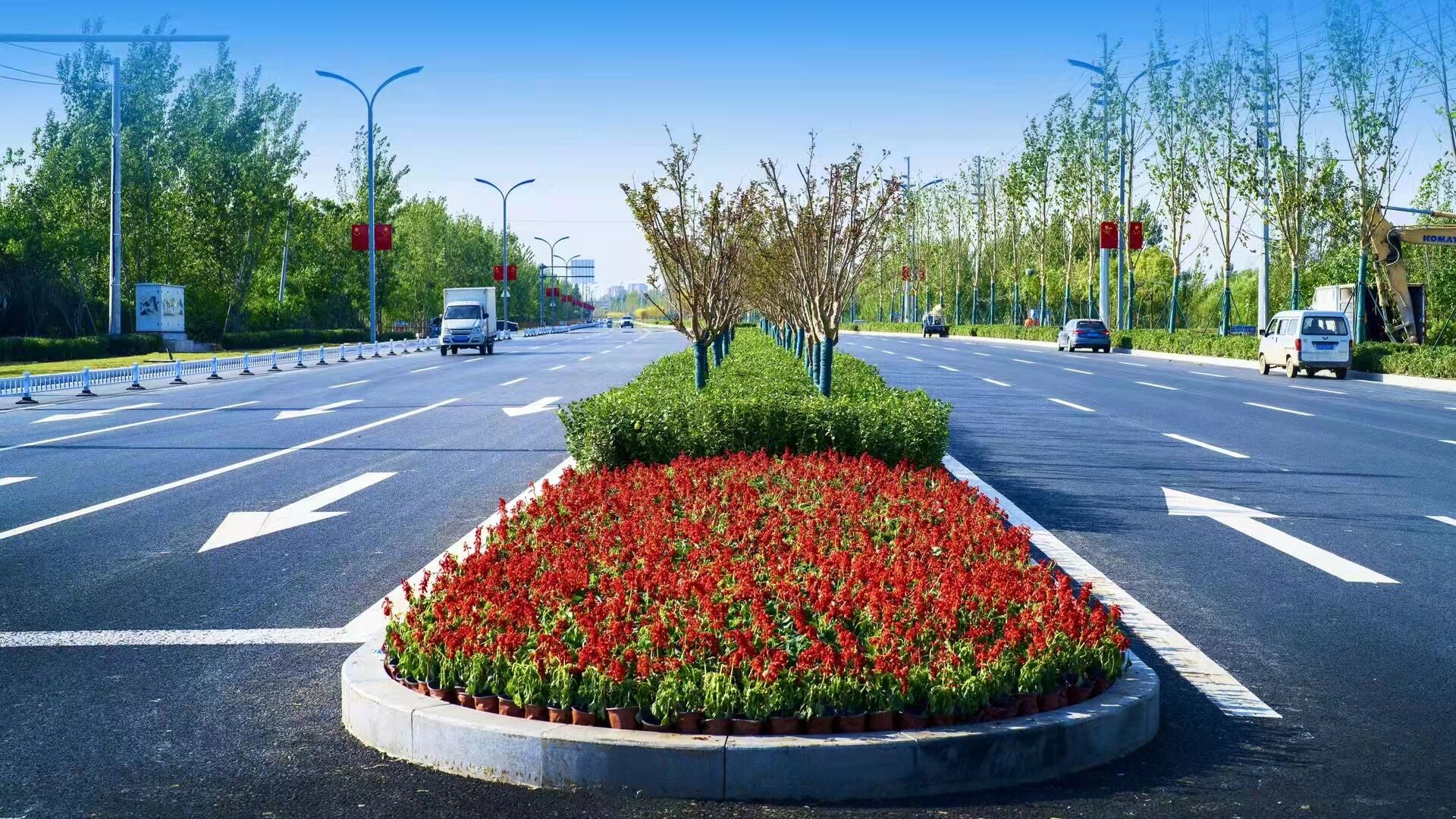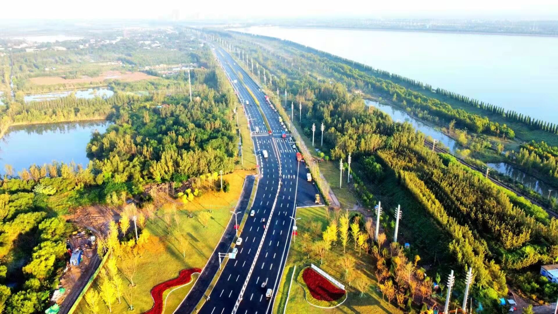 园林公司承建的总部经济区与济泺路隧道交通联络线工程位于济南市起步区大桥镇,东起黄河济泺路隧道收费站西至S101互通立交,道路全长1.6km,总绿化面积10万余平方米。工程从9月11日开工,共用时20天,集中栽植乔灌木1054株、绿篱地被7500平方、时令花卉80000余株、草坪铺植35000平方、不锈钢景观字体1组。