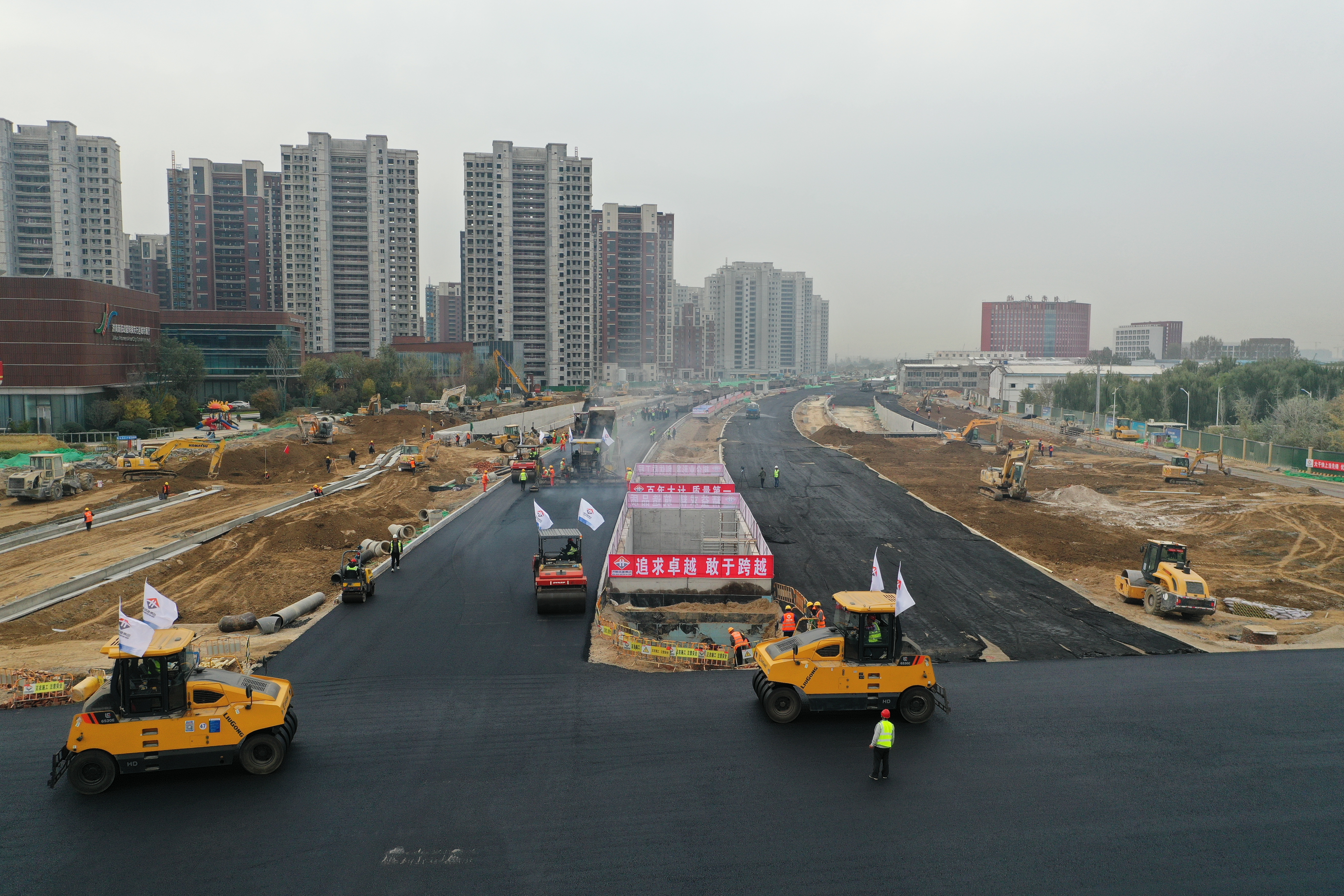 黄河大道不仅工期紧、工程量大,施工组织难度等任务非常艰巨。利用两个月的时间完成160万立方米地道基坑土方开挖约,相当于开挖两个大明湖的方量,严格执行环保标准要求,强化扬尘管控,完成钢筋制安8.6万吨,浇筑混凝土43.9万立方米,地面道路水稳18万吨,沥青12万吨;同时,为保障工程深基坑、塔吊、支架模板、大体积混凝土浇筑等施工方案可行性,集团指挥部邀请相关专家进行专项论证,施工中统一调度、反复优化。集团项目部针对各工区施工任务和难点,科学制定施工计划,合理调配作业机械,组织集中优势力量,迎难而上、强力攻坚、苦干实干,逐一攻克施工难点重点,成功破解一个又一个施工难点,为项目如期推进保驾护航。