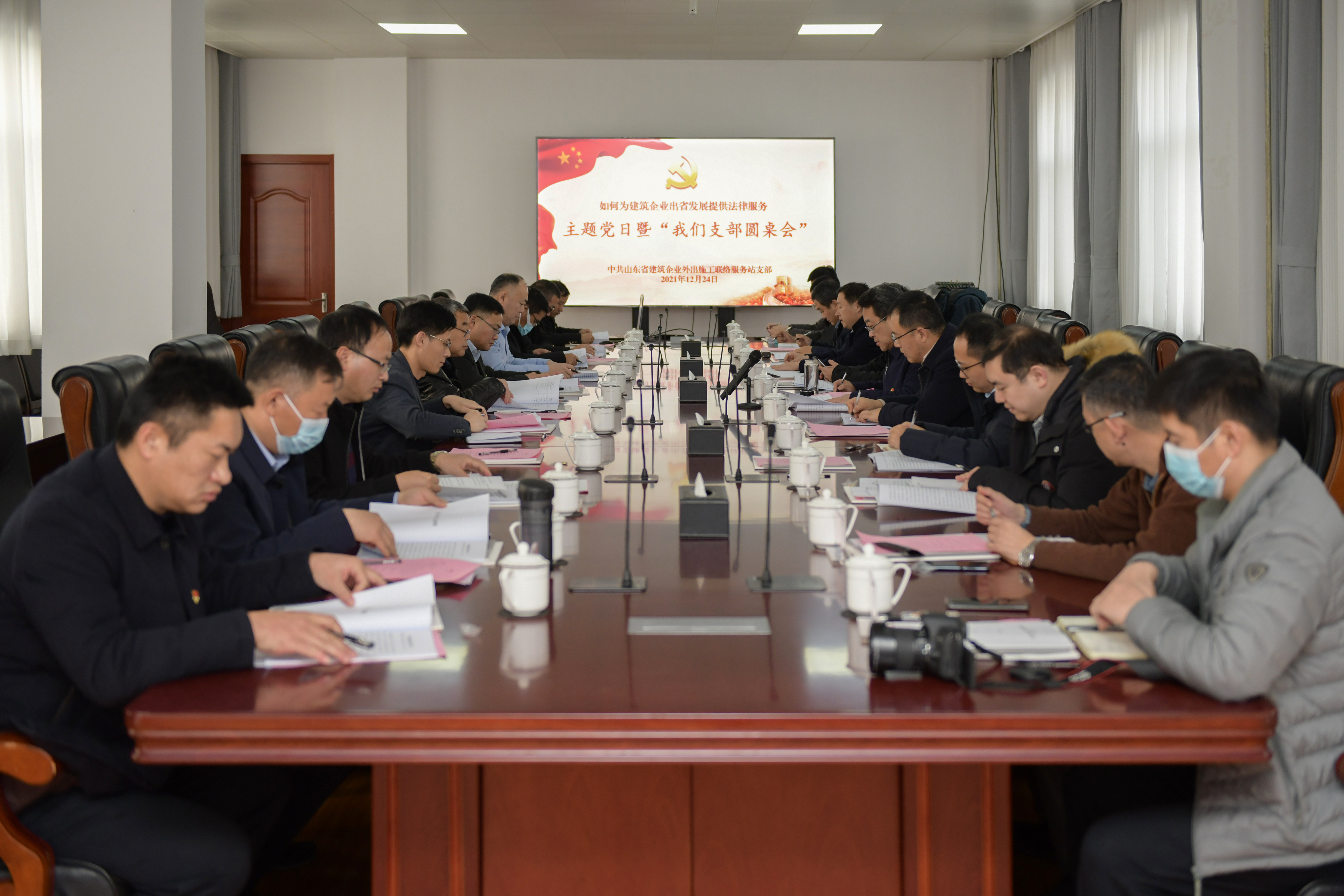 2021年12月24日下午,集团与山东省建筑企业外出施工联络服务站等单位联合组织开展主题党日暨“我们支部圆桌会”活动在汇通公司举行。省住房城乡建设厅二级巡视员殷涛,省司法厅律师工作处副处长李凌云,省建筑企业外出施工联络服务站党支部书记、主任戚立强,集团总工程师许庚等参加活动。