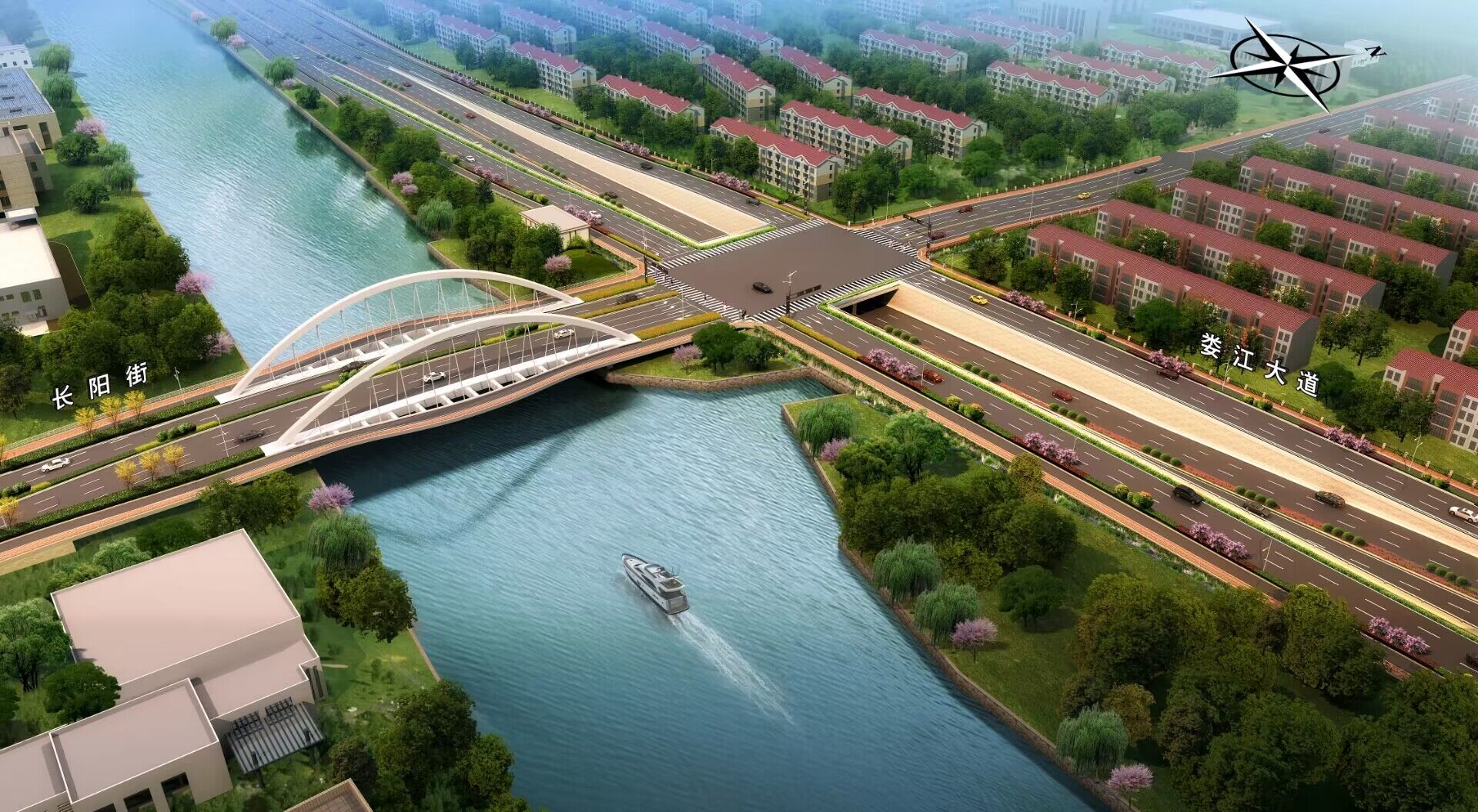 长阳街北延工程北起金陵西路,南至苏虹东路,设计有跨娄江河外倾式钢结构系杆拱桥,桥拱造型犹如一轮明月,将美好的月亮意象与娄江完美融合。该工程同步对娄江大道进行改造,改造路段全长1734米,工程建成后将成为唯亭东部片区跨娄江通行的重要通道,有效分流中环东线交通压力,对于完善园区骨架路网系统、方便周边居民出行、促进唯亭东部片区经济社会发展具有重要意义。